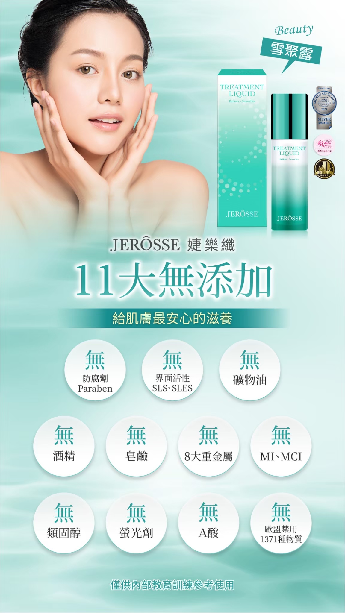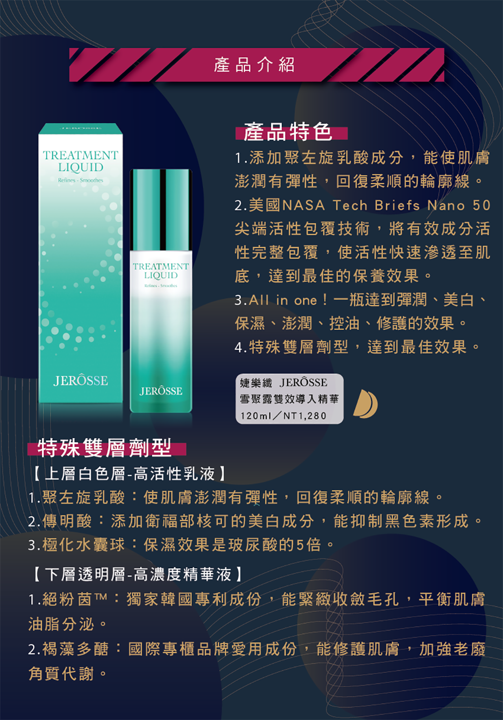 雪聚露雙效導入精華中添加多種專利成分,並使用美國NASA航太總署Tech Briefs的Nano 50尖端活性包覆技術,能保持肌膚健康、維持肌膚彈性,展現迷人風采。