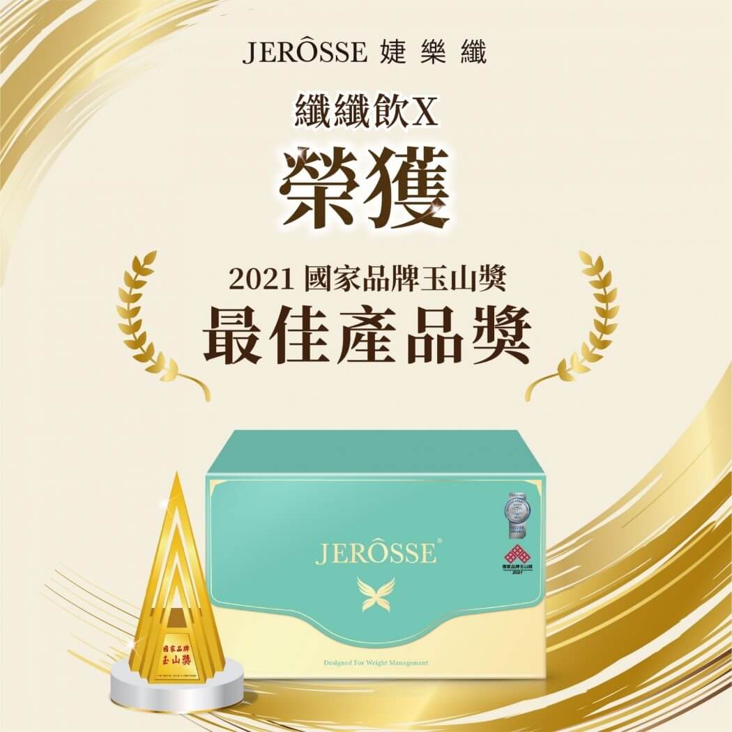 婕樂纖 纖纖飲X 獲得35項原料專利、2021年亞太美業精品獎 卓越品質獎、2021世界品質評鑑大賞銀獎、2021年國家品牌玉山獎 最佳產品類獎 肯定。